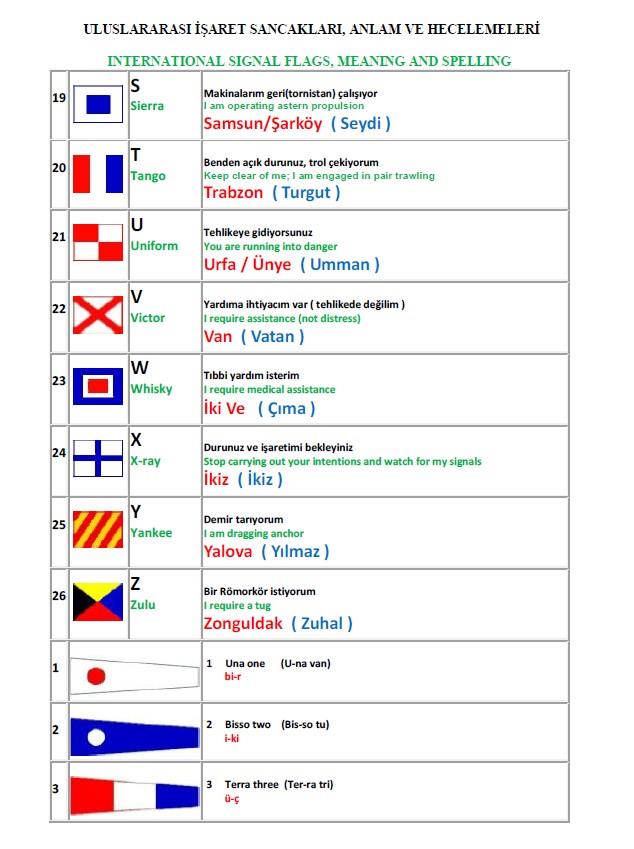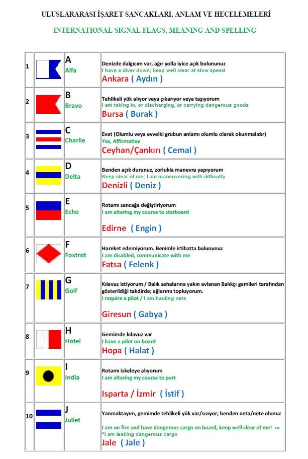 Gemilerin kendi aralarında (gemi-gemi) veya sahil (gemi-sahil) istasyonları arasında her biri bir harf veya rakamı belirten Sancak ve Flamalar ile yaptıkları bir haberleşme şeklidir. İşaret sancakları gemilerde direklerin Seren ( teknelerde gurcata ) savlolarına sancak taraftaki ilk savlodan başlamak üzere çekilerek kullanılır.Amaç;lisan güçlükleri halinde gerekli seyir ve can emniyeti durumlarına ait haberleşmeyi sağlamaktır. Sancaklarla ; Uluslararası İşaret Kod Kitabını kullanarak yapılan haberleşmede; 26 adet Harf Sancağı, 10 adet Rakam Flaması, 3 adet Bedel veya yerine ( Tekrar ) ve 1 adet Cevap Flamasından oluşan 40 parçalık bir takım kullanılır.